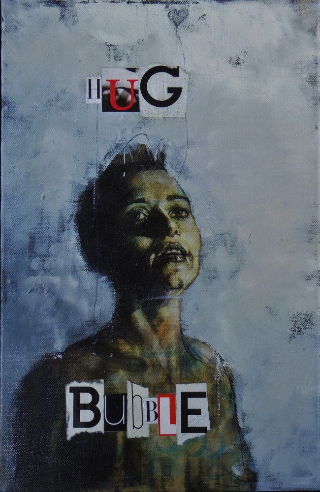 ‘hug bubble (because we were angels)’, mixed media on canvas, 26 x 40 cm, 2017