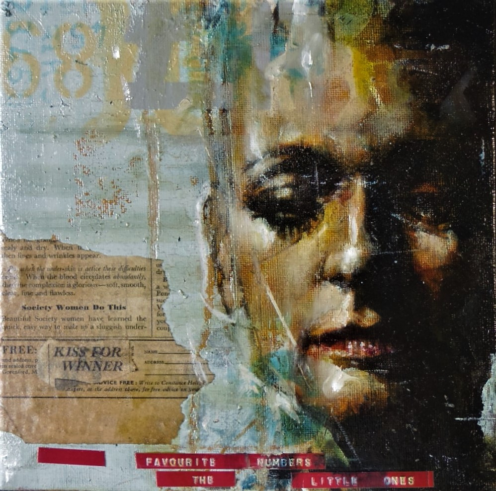 ‘her favourite number’, oil and collage on canvas, 20 x 20 cm