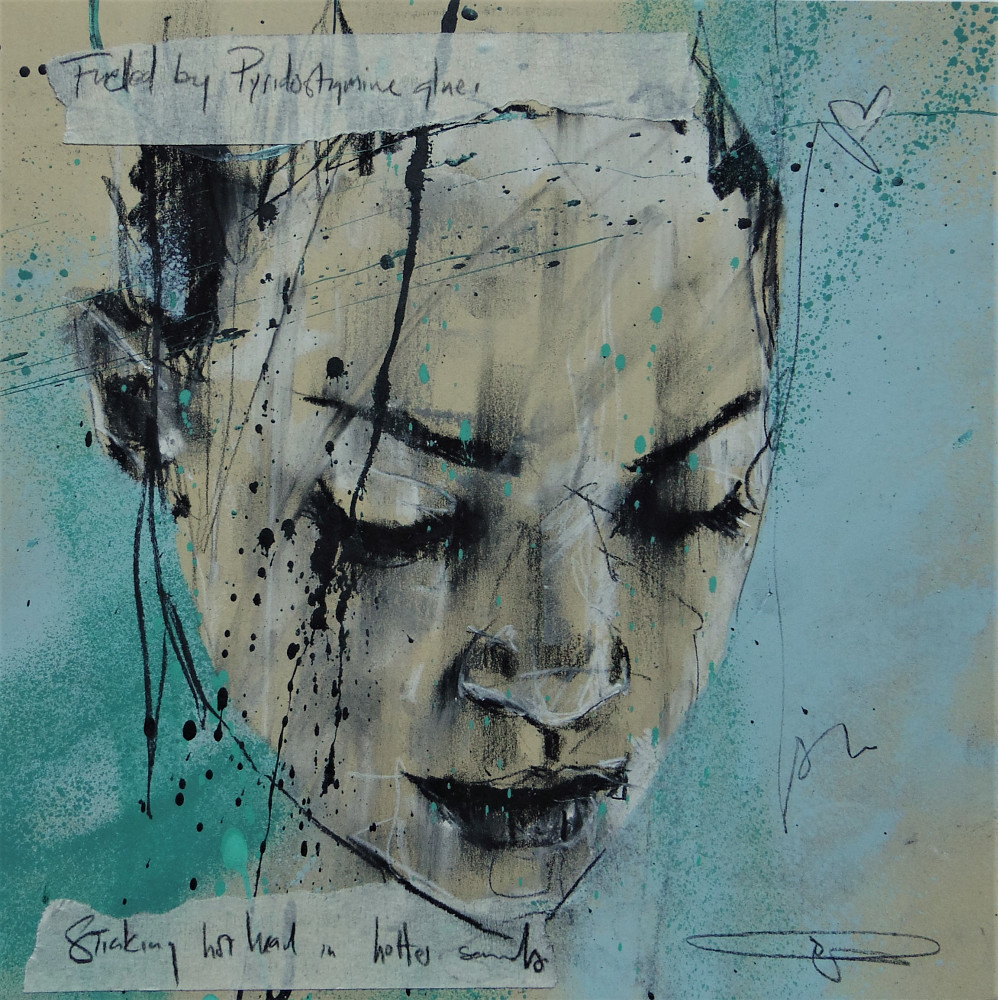 05 ‘Fuelled by Pyridostigmine glue. Sticking hot head in hotter sands’, pastel and spraypaint on paper, 23 x 23 cm