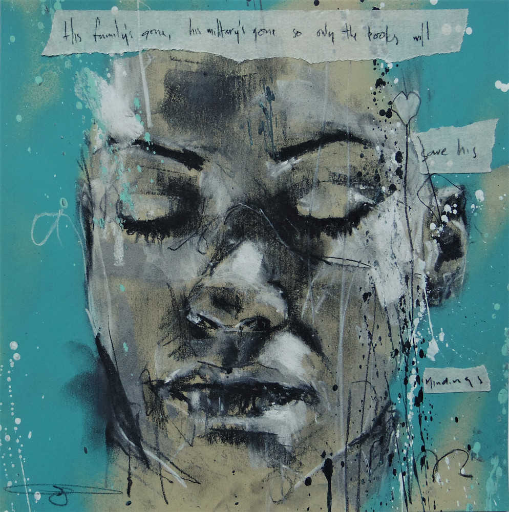 07 ‘His family’s gone, his military’s gone so only the books will save his mindings’, pastel and spraypaint on paper, 23 x 23 cm