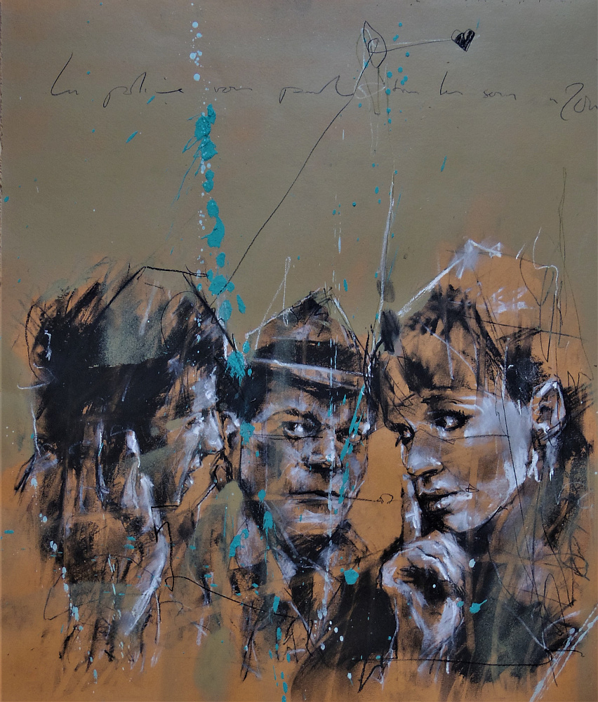‘La police vous parle tous les soirs à 20h’ conte, pastel and paint on paper, 40 x 50 cm