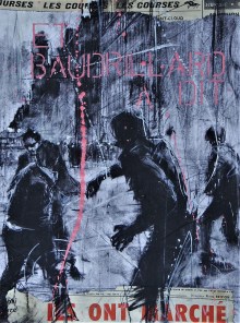 ‘Parisien history drawing (et Baudrillard a dit)’ conte, pastel, paint and collage on paper, 29 x 39 cm