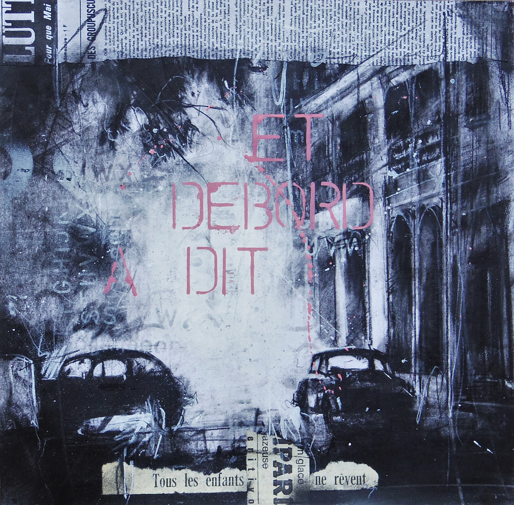 ‘Parisien history drawing (et Debord a dit)’ conte, pastel, paint and collage on paper, 30 x 30 cm