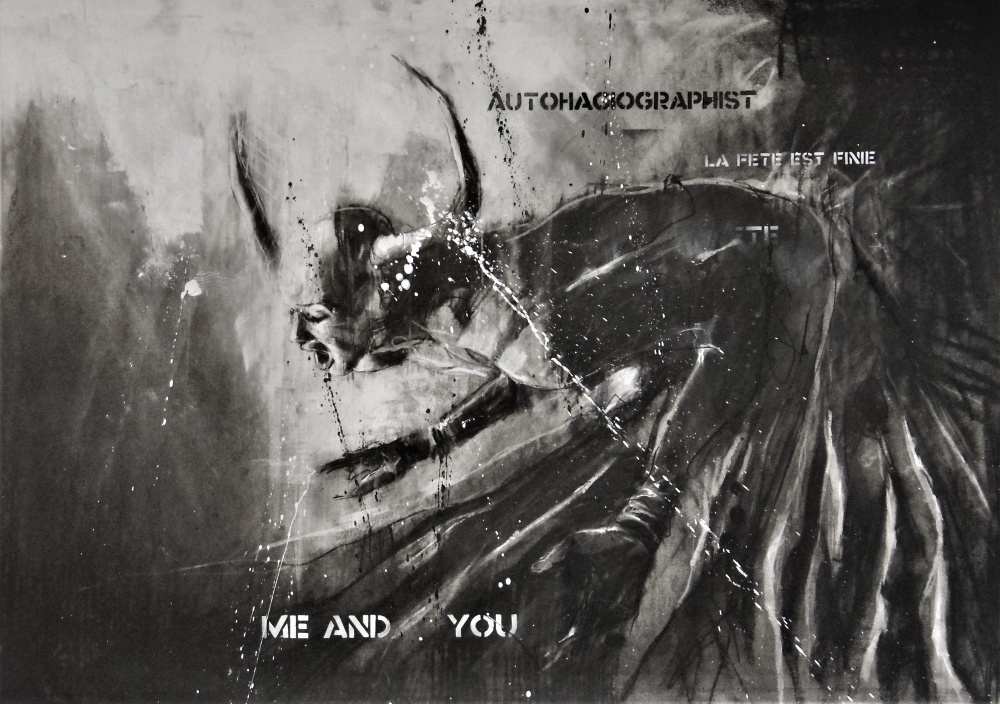 ‘the autohagiographist supervises’, mixed media drawing, 60 x 90 cm, 2019