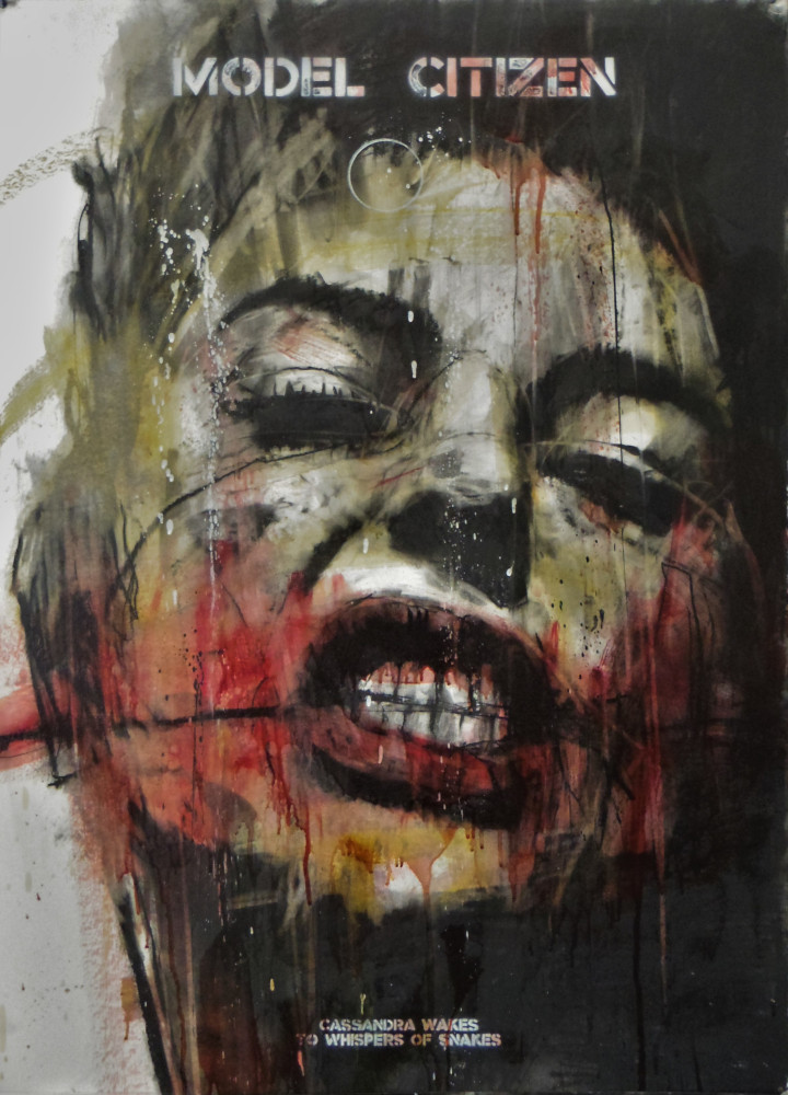 ‘cassandra wakes, to whispers of snakes’, mixed media painting on paper, 70 x 100 cm, 2022