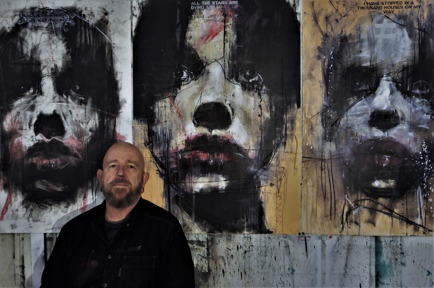 Denning has an impressive but unorthodox affinity with mixing media and techniques together. Stencils, spray cans, brushwork, dripping paint, crayons, gold-leaf, marker pen and conté pastel… Some pieces drawn on mid-toned paper, newsprint or torn packing card that give them an expressive economy. The mid tones are already there, which means he can focus his powerful and deceptively simple draughtsmanship all the more on the contrast and highlights added in black and white.